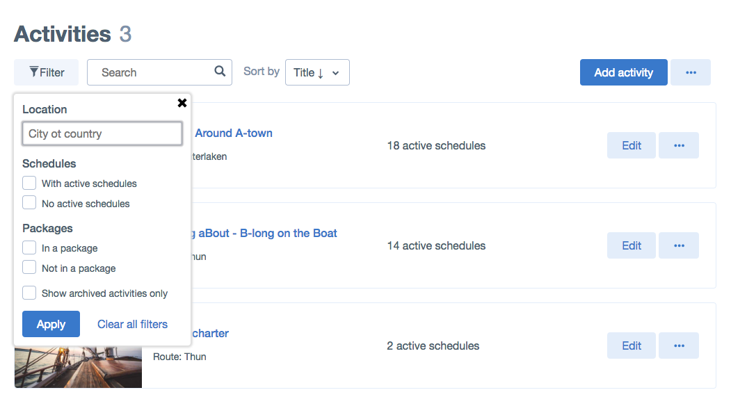 In the Activities overview page, we added a few things to make it easier for your to view and find the activities you're looking for. Firstly, we created a filter which you can use to view activities based on location, schedules (active or inactive) and whether its in a package.