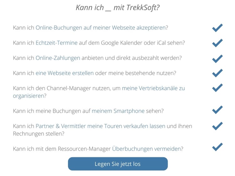 Wir arbeiten nur mit seriösen und erstklassigen Partnern zusammen, die lizenziert und zertifiziert sind. Mit dem Ziel weitere Aktivitäten zu verkaufen und im Vorfeld die Kapazitäten unserer Gäste zu verwalten, ist es ein enormer Vorteil, wenn unsere Partner ebenfalls TrekkSoft nutzen.