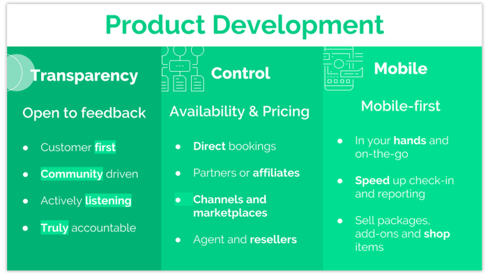 We also want to give you full control over your availabilities and pricing across all sales channels, whether it's working with online travel agents, resellers or in-destination booking agents.
