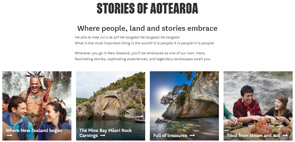 Nueva Zelanda está usando la página "historias sobre". Es un muy buen ejemplo sobre cómo contar historias de gente local. Tal cual lo lees, parece que estás en el lugar.
