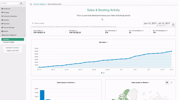 Ecco una panoramica della Business Intelligence di TrekkSoft, con una vasta reportistica per tracciare le vendite, il giro d'affari e le performance di ogni canale.